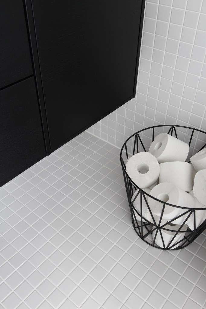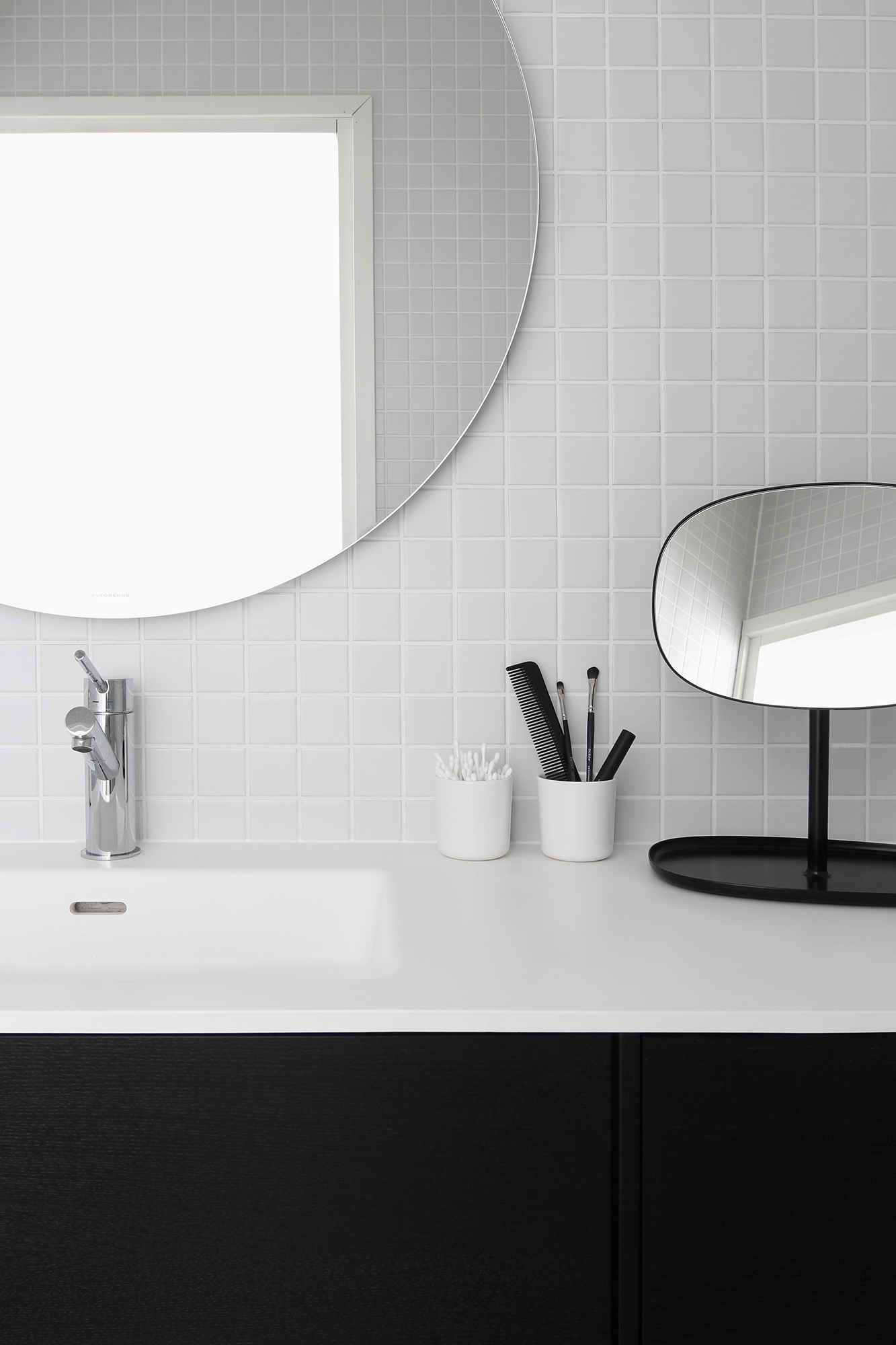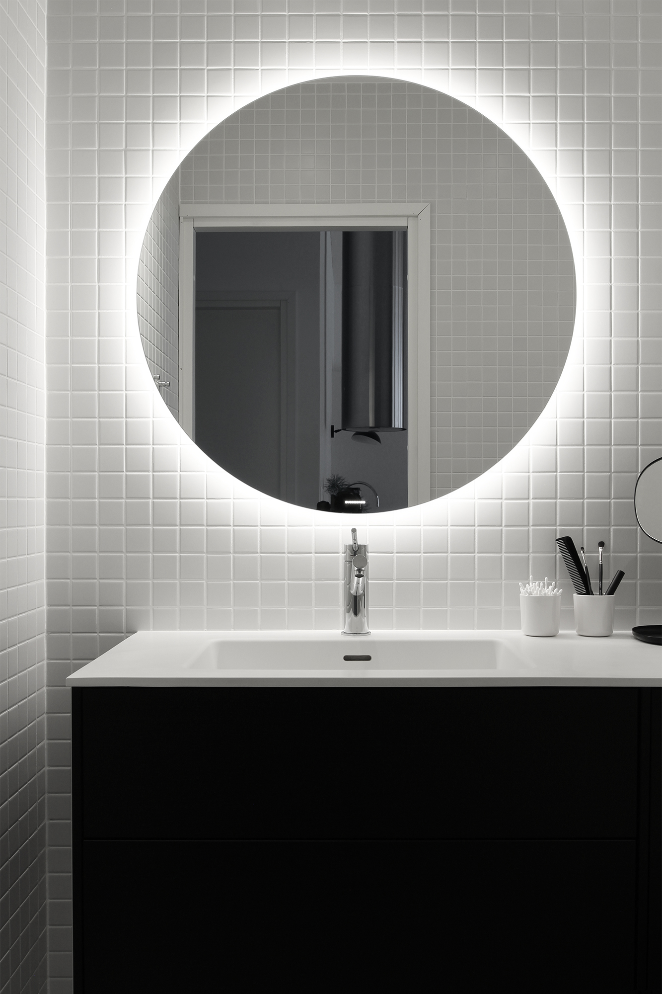 Peilin epäsuora valo tuo mosaiikkilaatan luonteen tosi nätisti esille, luoden samalla ihanan pehmeän ja lämpimän tunnelman, vaikka värimaailma onkin tosi mustavalkoinen.