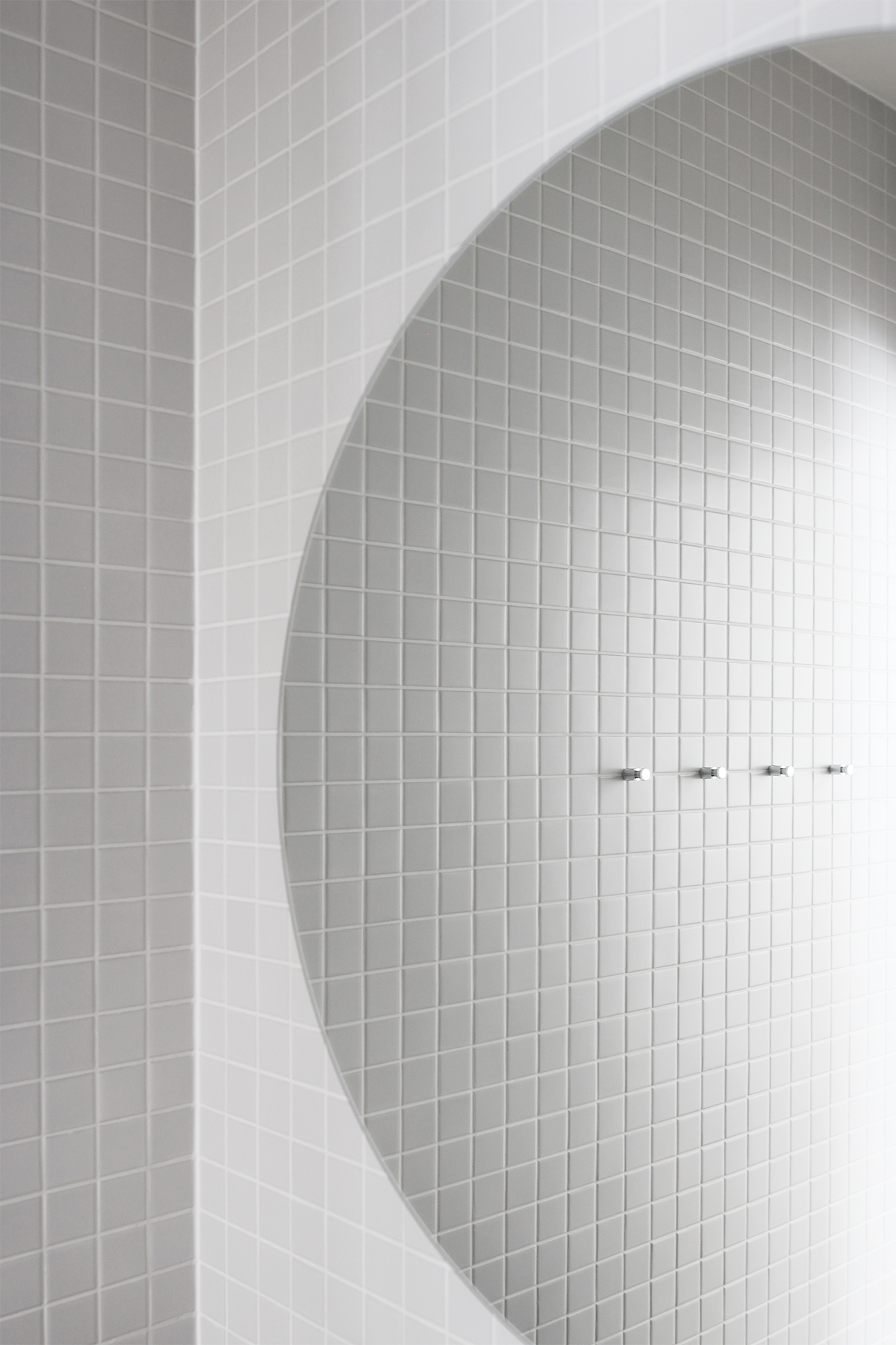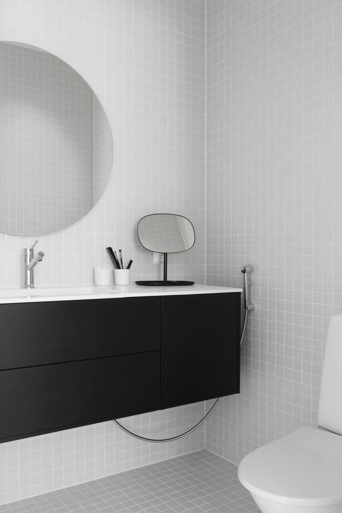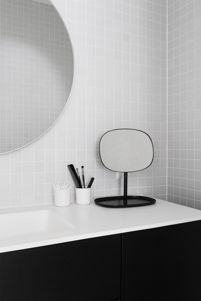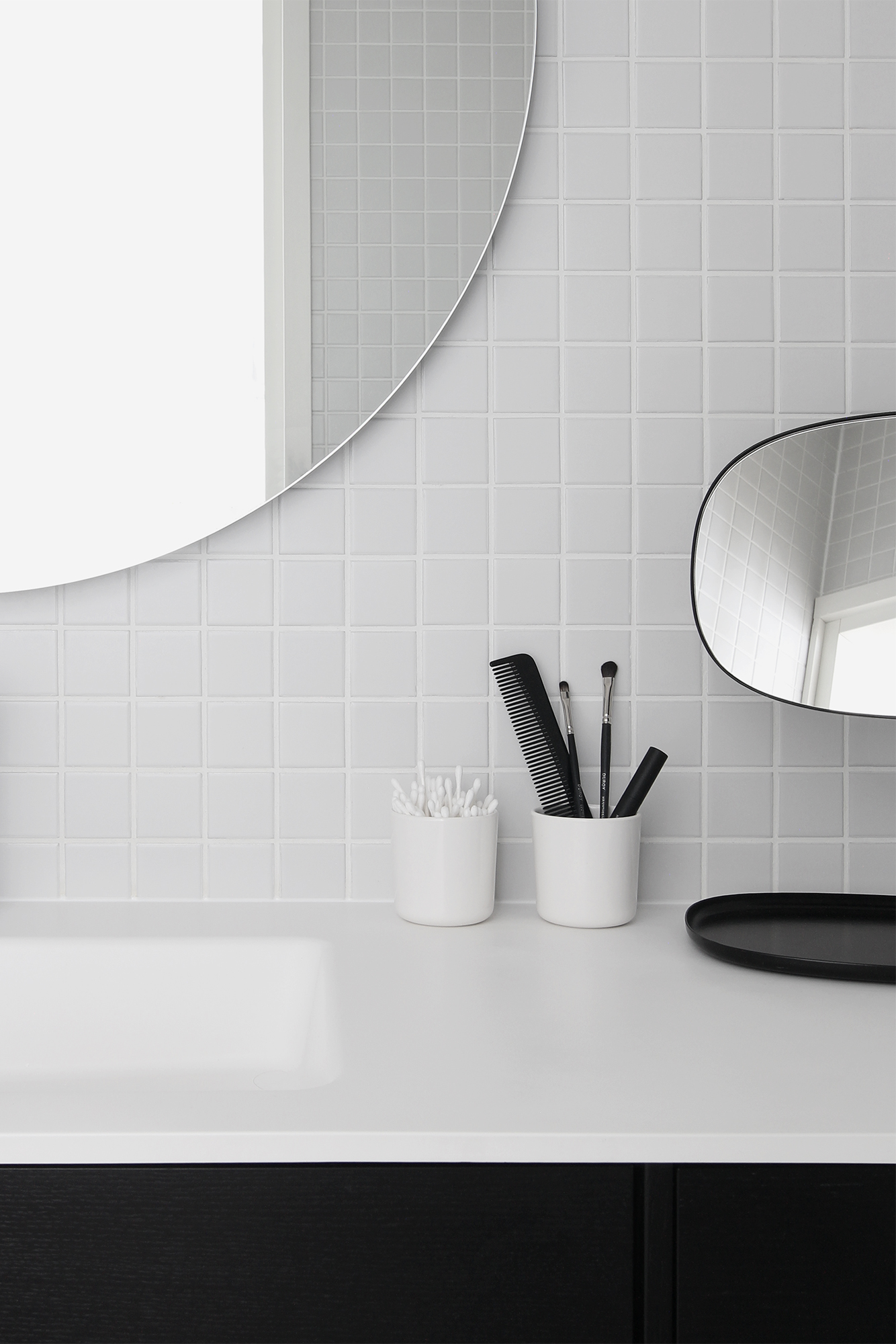 Peilin epäsuora valo tuo mosaiikkilaatan luonteen tosi nätisti esille, luoden samalla ihanan pehmeän ja lämpimän tunnelman, vaikka värimaailma onkin tosi mustavalkoinen.