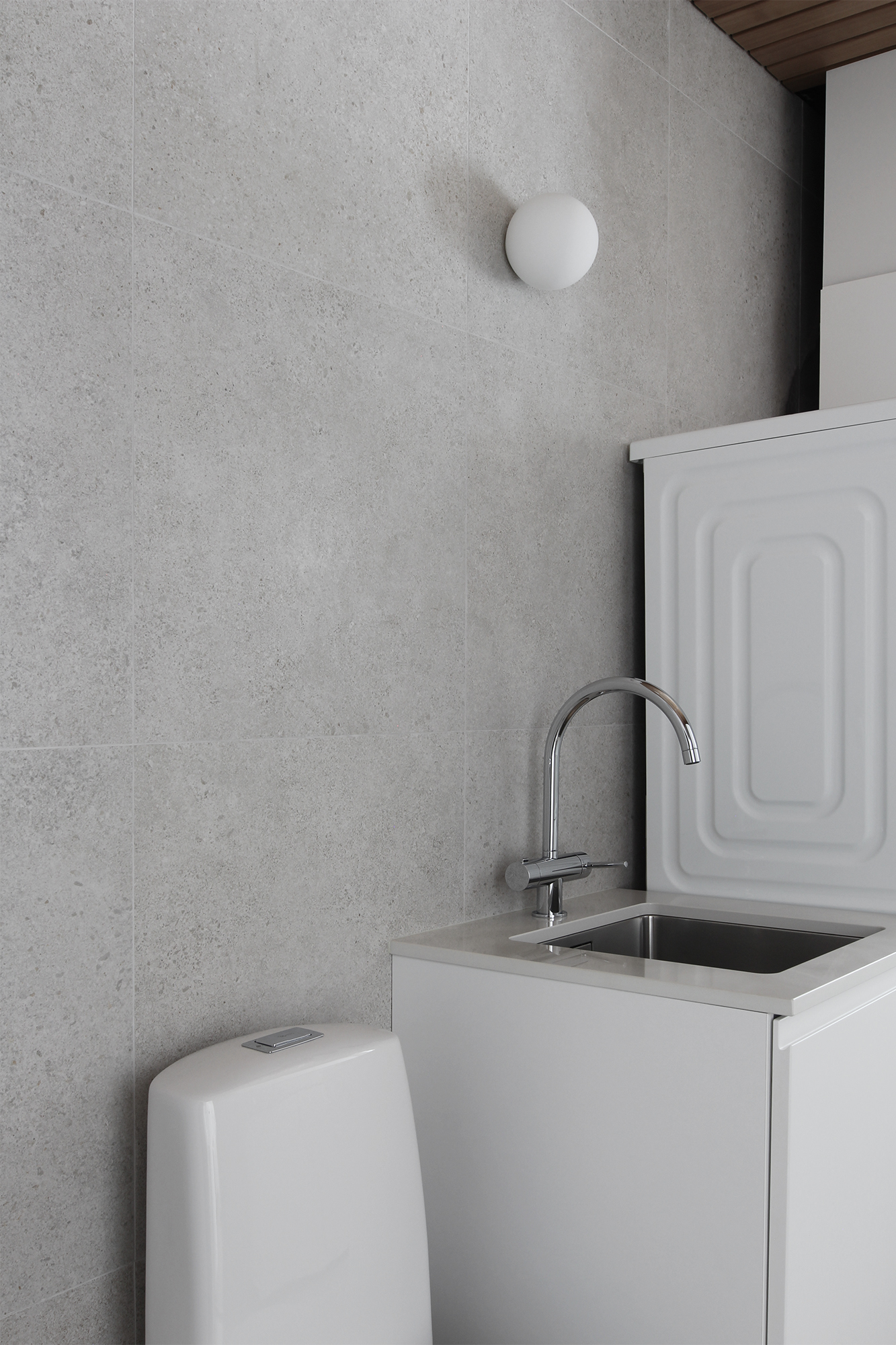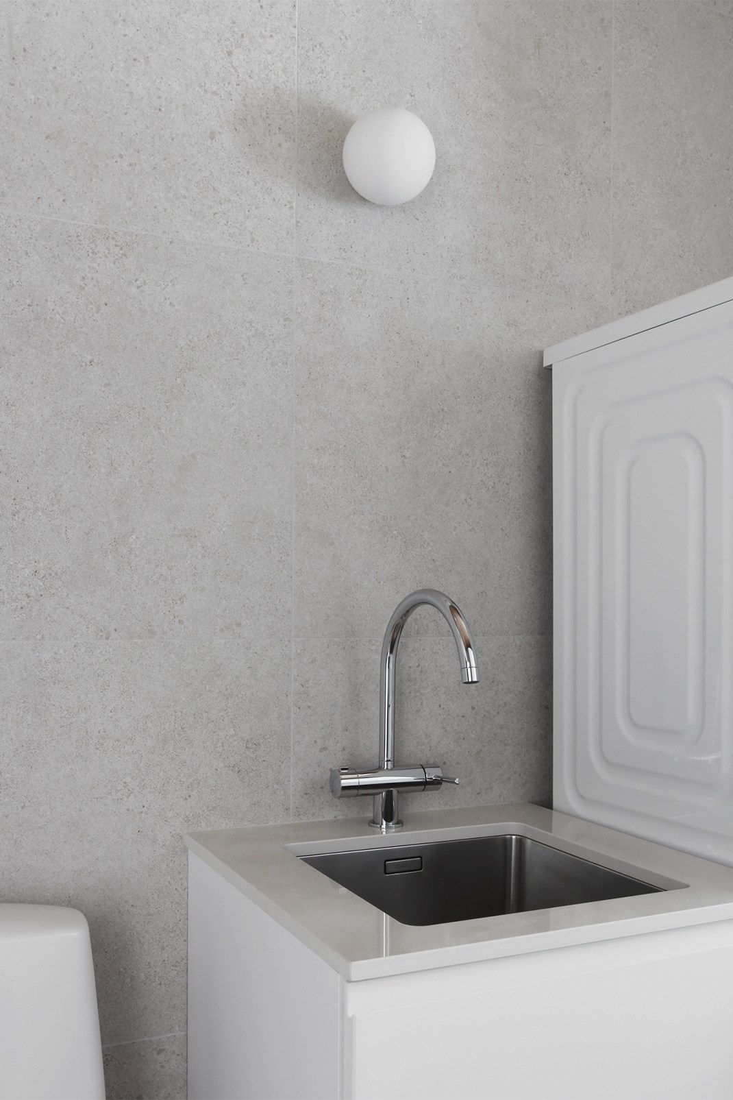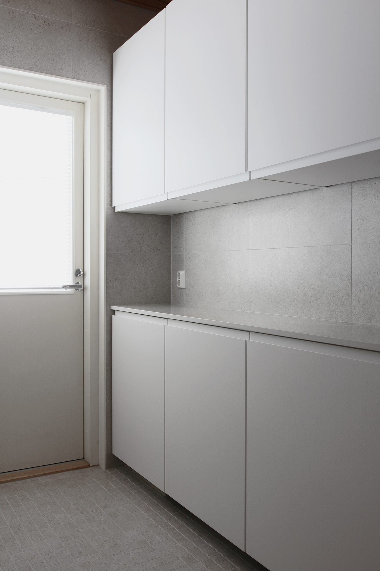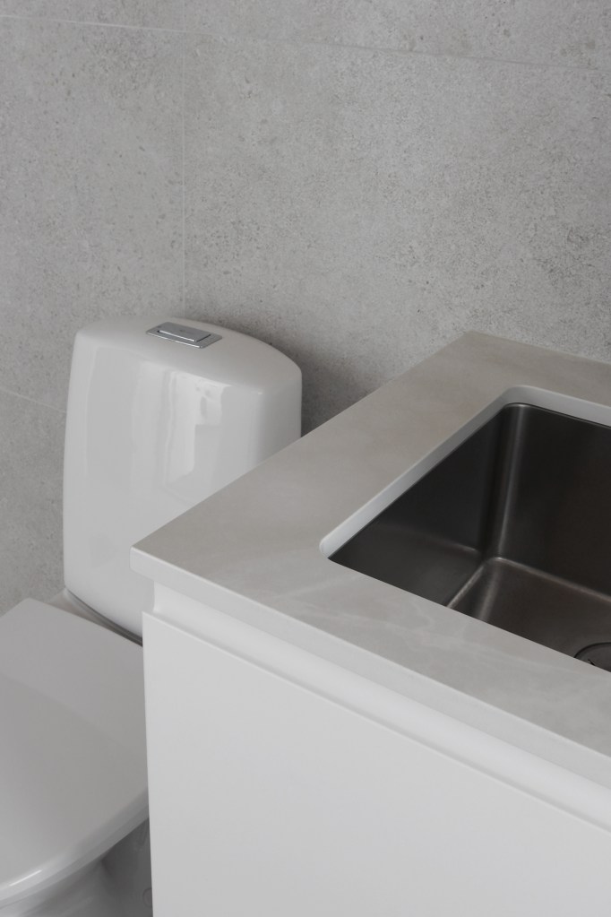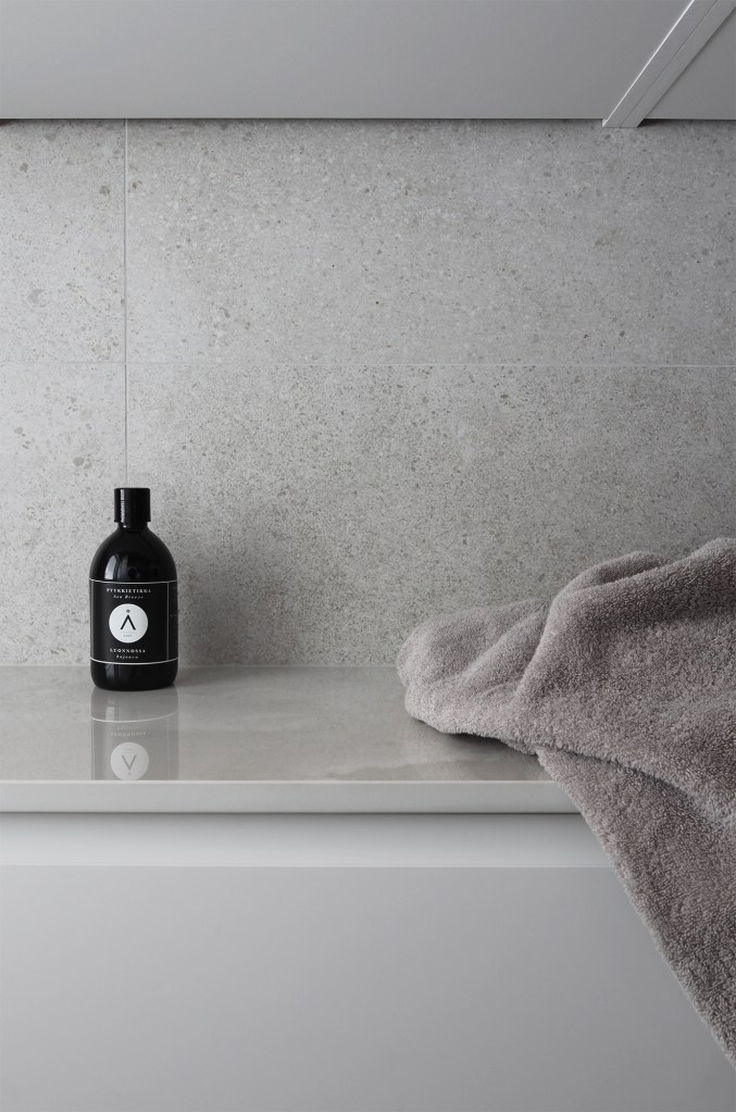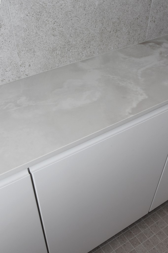 Dekton on erittäin kestävä materiaali. Se on valmistettu luonnon mineraaleista ja sen vedenimukyky on lähes nolla, joten se sopii loistavasti kylpyhuoneeseen. Dekton on tosi arvokas materiaali, mutta koska tila tai tasojen koko ei ollut kovinkaan suuri, mahtui se hyvin omaan budjettiini. Olin ihan fiiliksissä, miten nopeasti ja helposti sopiva materiaali löytyikään, hieman jopa sattumalta. Nyt saan ripauksen luksusta kodinhoitohuoneeseen.