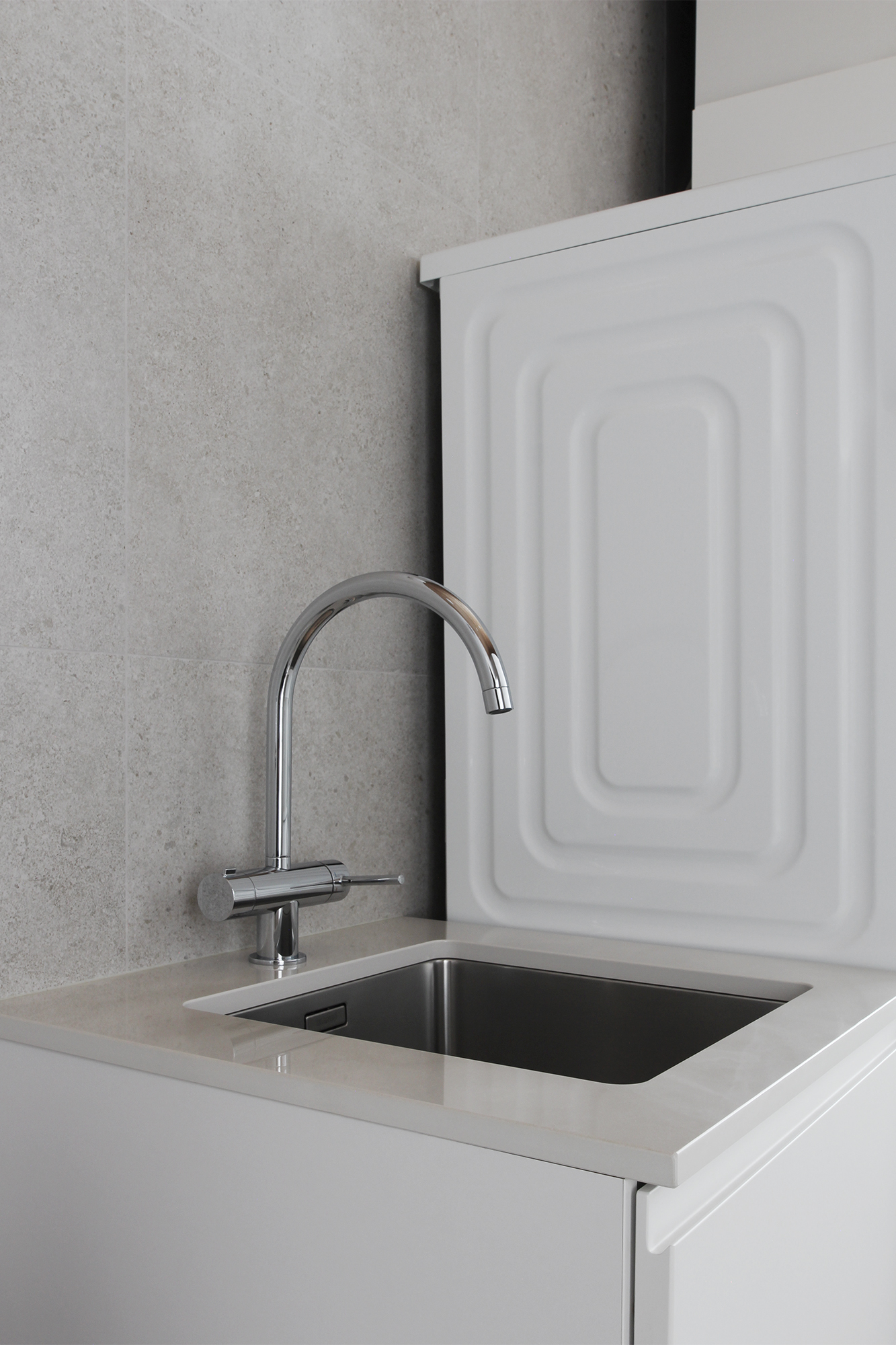 Kodin viimeistely ja valmistuminen on ollut omanlainen prosessinsa. Silloin kun muutin sisään, talo oli vielä melko keskeneräinen. Saimme paikat kuitenkin siihen malliin, että sain muuttoluvan. Tuossa kohtaa keittiöstä ja kodinhoitohuoneesta puuttui vielä tasot, sen vuoksi myös hanat ja pesualtaat. Halusin tehdä valinnat tasojen suhteen rauhassa ja nähdä ensin ympärillä olevat kalusteet sekä materiaalit paikoillaan.
