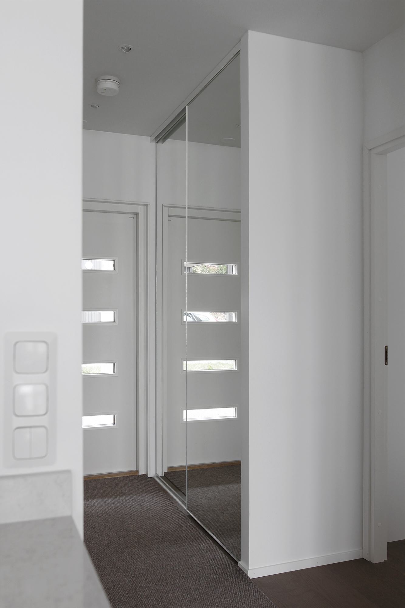 Liukuoviksi valitsin vetimettömät peiliovet, joissa on ohuet valkoiset Design A7 -alumiinikehykset. Isojen peilien ansiosta sai kapeaan eteiseen valtavasti lisää tilan tuntua ja valoisuutta. Liukuoviin on mahdollista lisätä jälkikäteen vetimet, mutta toistaiseksi olen ollut ilman. Hyvin on kaapit toimineet ilman vetimiäkin.