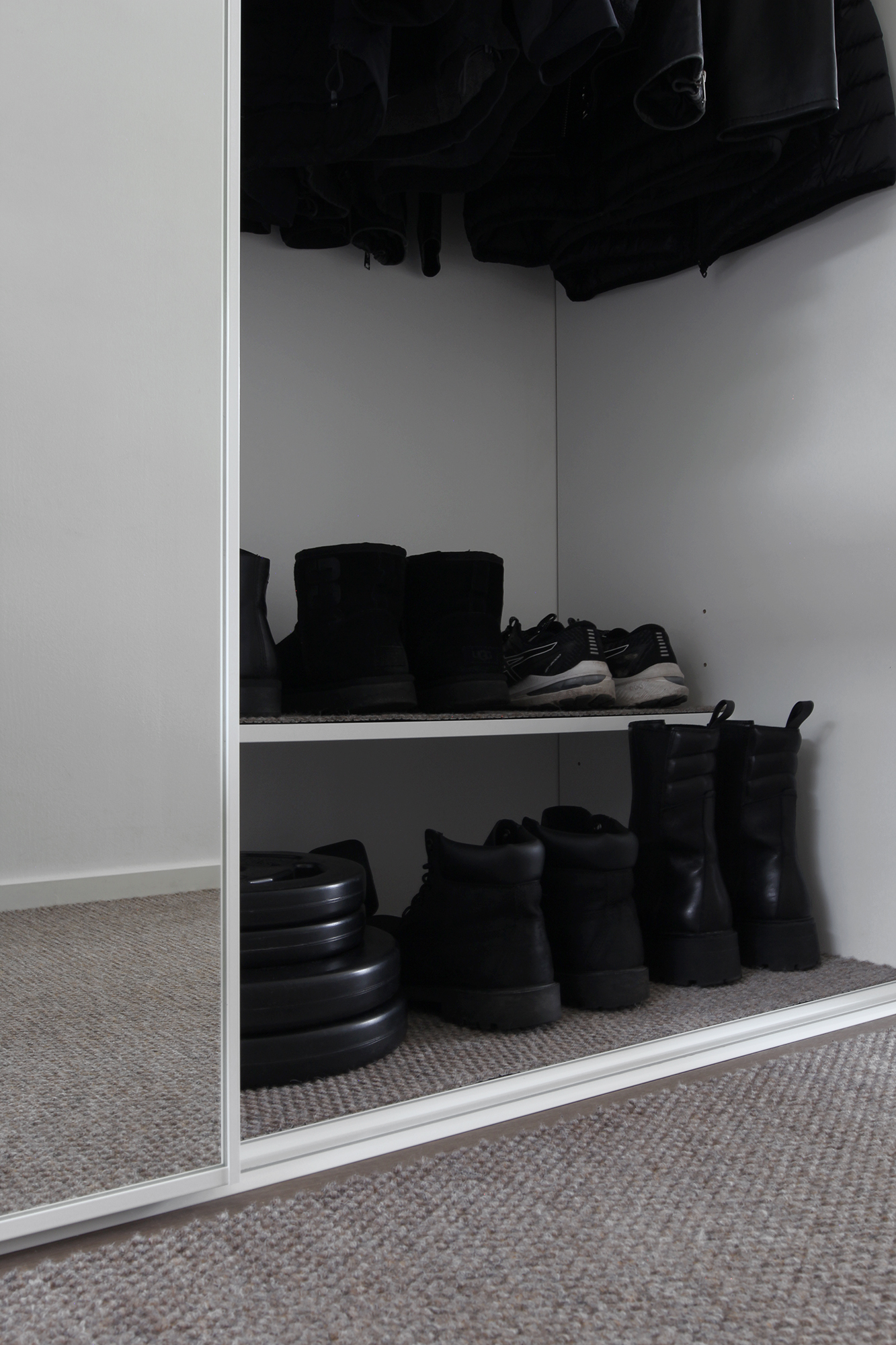Säilytän eteisen kaapissa kaikki mahdolliset takit (untuva-, villakangas-, nahka- ja juoksutakit), untuvaliivit, kengät, kaulahuivit, pipot, hanskat ja heijastinliivit, sekä myös osan treenivarusteista, kuten BodyPump-tangon, levypainot, jumppakuminauhat ja käsipainot. Ainoastaan sadekelin vaatteet, eli sadetakki ja kumisaappaat säilytän varastossa, jonne jätän ne tarvittessa kuivumaan.