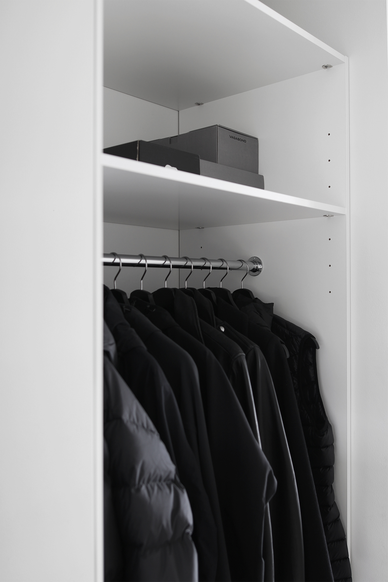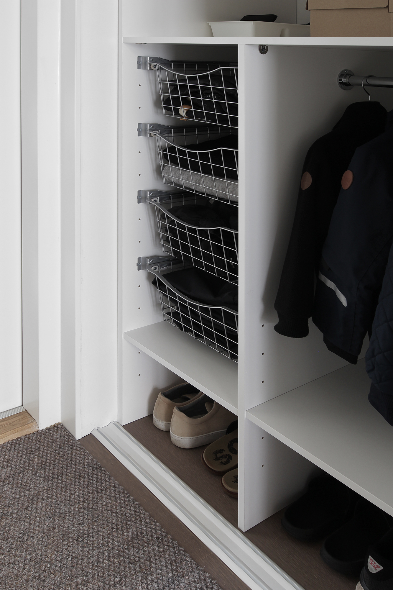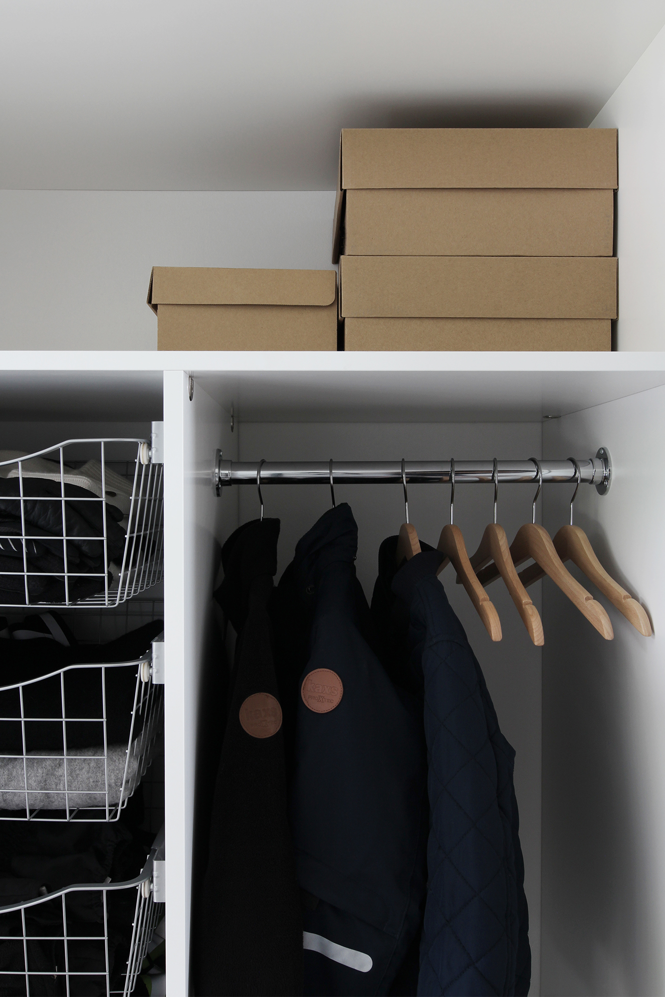Vaikka itselläni oli selkeästi mielessä mitä halusin, sain loistavia ehdotuksia kaapin toiminnallisuuteen. Alkujaan ajattelin laittaa kaappeihin tyylikkäät umpinaiset vedettävät laatikot asusteille, mutta minulle suositeltiin avointa korimallia, koska usein lasten pipot ja hanskat ovat käytön jälkeen kosteita, eikä umpinaisessa mallissa ne pääse juuri kuivumaan. Todella hyvä pointti! Korit jäävät kuitenkin liukuovien taakse piiloon, joten päädyin niihin.