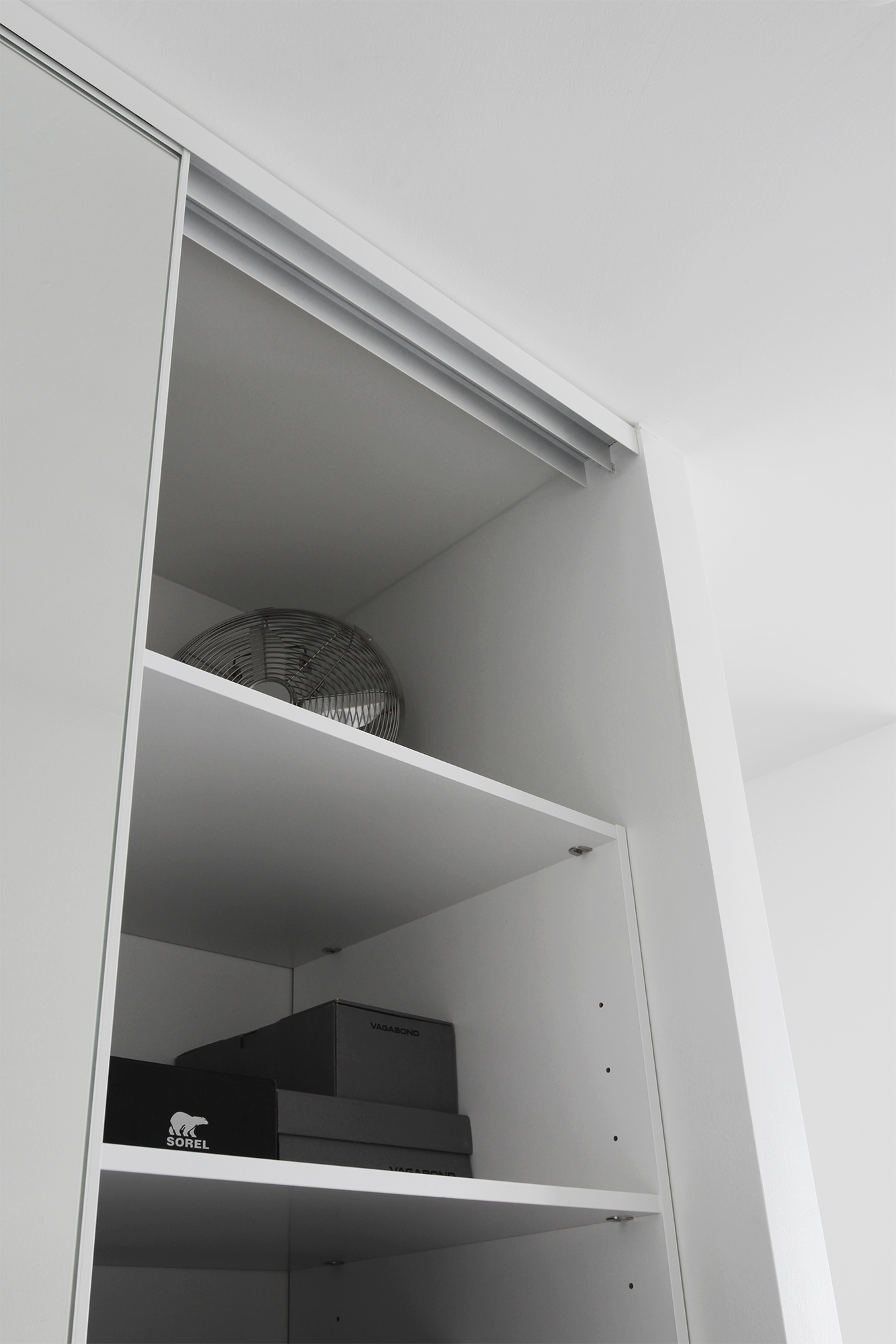 Rakensimme liukuovia varten lyhyen seinäpätkän, jotta kokonaisuus on selkeämpi. Liukuovet asennettiin rungon eteen, eli ne ei ole kiinni rungossa. Ovissa on pölysuojattu yläpyörästö sekä hypynestot, joten ovet ovat erittäin turvalliset lapsiperheissä.