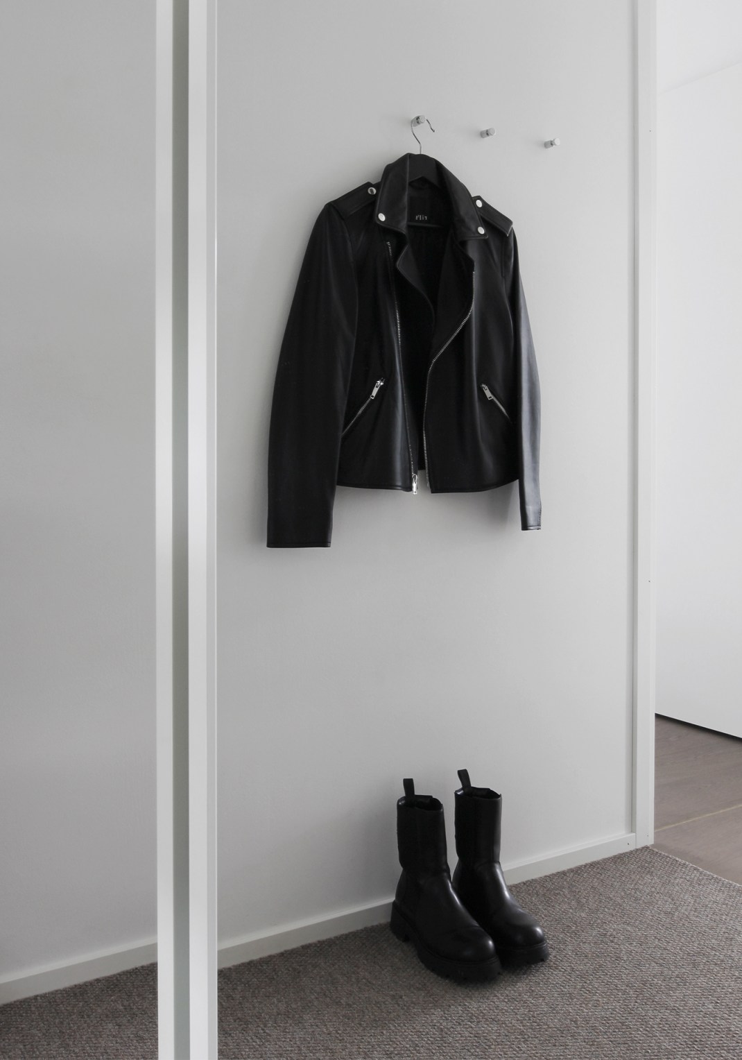 Säilytän eteisen kaapissa kaikki mahdolliset takit (untuva-, villakangas-, nahka- ja juoksutakit), untuvaliivit, kengät, kaulahuivit, pipot, hanskat ja heijastinliivit, sekä myös osan treenivarusteista, kuten BodyPump-tangon, levypainot, jumppakuminauhat ja käsipainot. Ainoastaan sadekelin vaatteet, eli sadetakki ja kumisaappaat säilytän varastossa, jonne jätän ne tarvittessa kuivumaan.