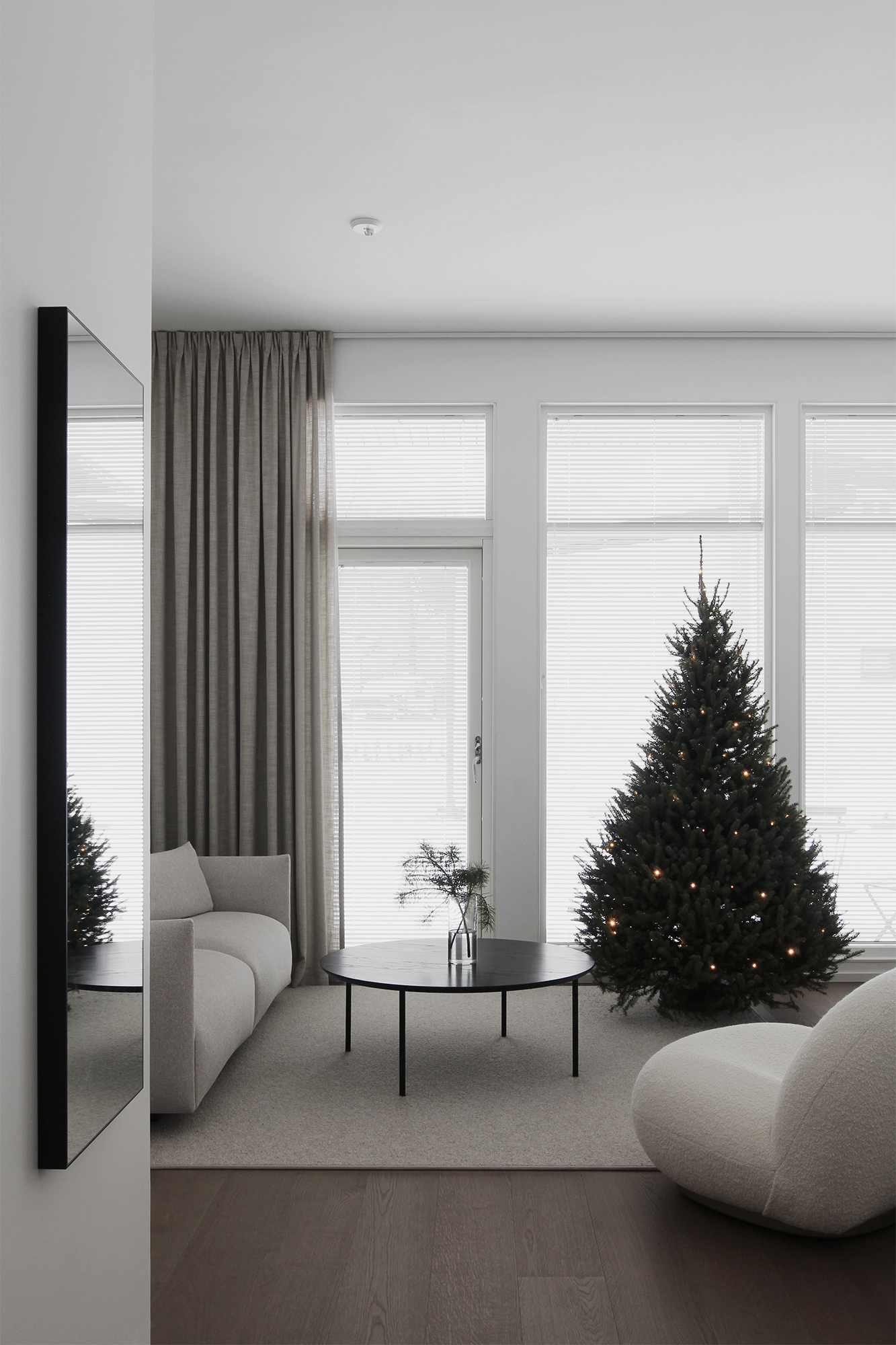 En ole ihan varma mitä lajiketta tuo kuusi on, todennäköisesti Serbiankuusi. Neulasto on todella tiheä ja pistävä, väri hieman harmahtava. Kuusessa on omasta takaa käpyjä koristeena! Ne on ihania, vaikkei niin näykään. Lisäsin kuuseen valosarjan, joka loi aivan ihanan tunnelman. Ajattelin, että annetaan kuusi olla hetken pelkillä valoilla ja kaivetaan koristeet kaapista myöhemmin, jolloin lapset saavat koristella kuusen.