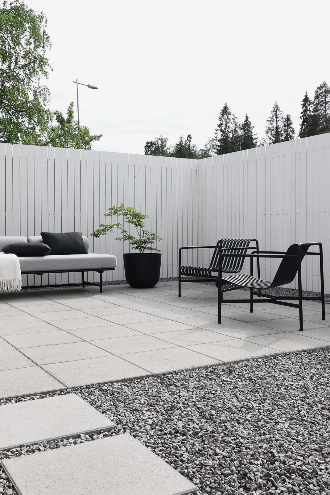 Olen niin fiiliksissä patiosta sekä uusista ihanista ulkokalusteista! Kokonaisuus alkaa muodostumaan tosi kivaksi ja mieleiseksi. Alkujaan pohdin kiinteitä ulkokalusteita, jotka olisi rakennettu aitaa vasten, mutta tämä ratkaisu on niin paljon parempi. Tilaa voi jakaa ja muokata sen mukaan mikä milloinkin on tarve.