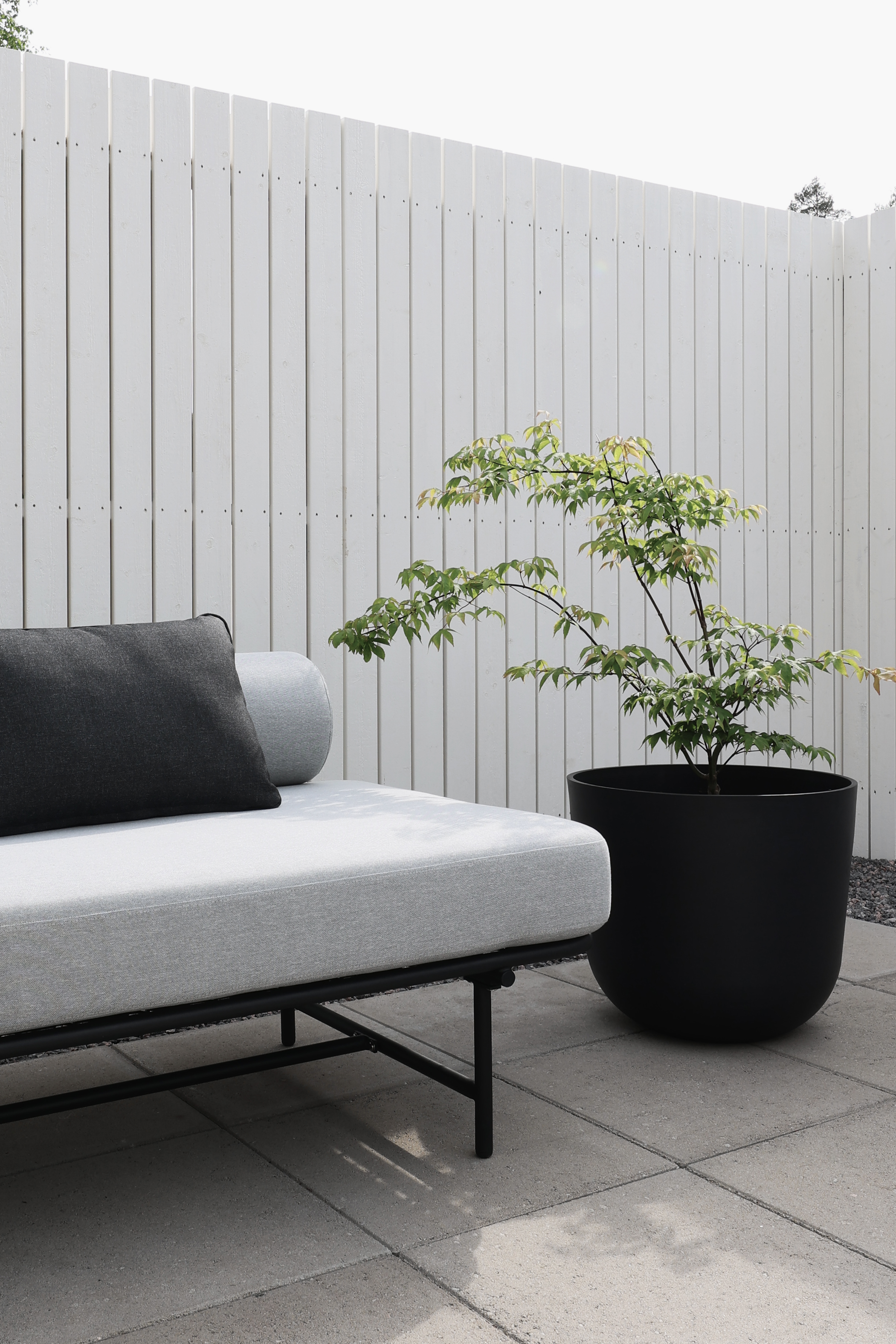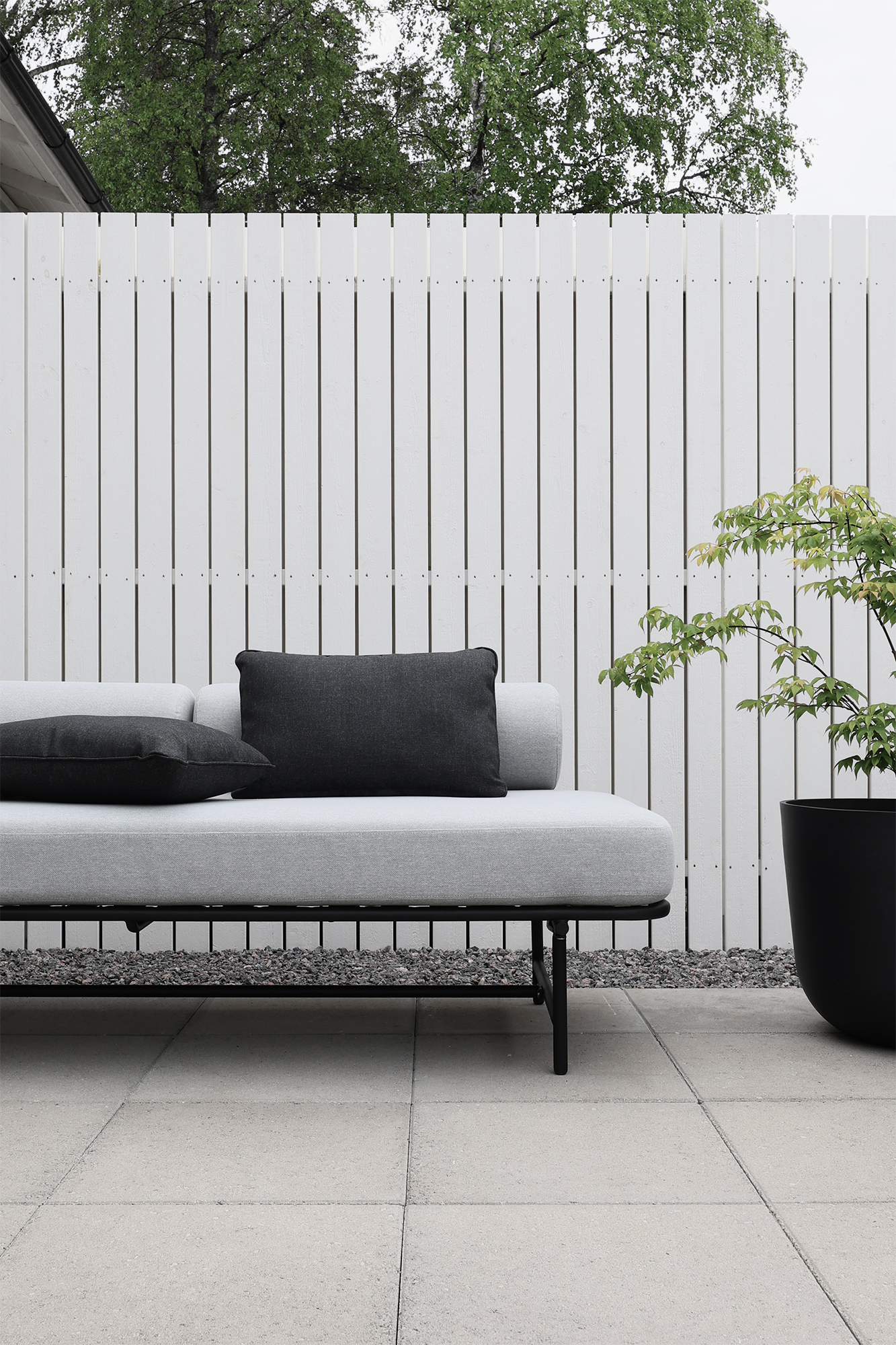 Daybedin mukana tuli kaksi meleeratun mustaa tyynyä, jotka olikin todella hyödyllisiä. Makuuasento tuntuu niiden ansiosta todella rentouttavalta. Daybedin patjan koko on 80 x 200 cm, eli siihen mahtuu loistavasti makoilemaan ja tarvittaessa se toimii myös vieraspetinä. Patjan kangas on raikkaan vaalea, meleeratun harmaa. Mustat tyynyt tuovat kivasti kontrastia.