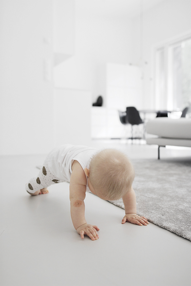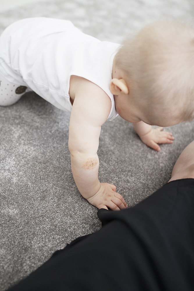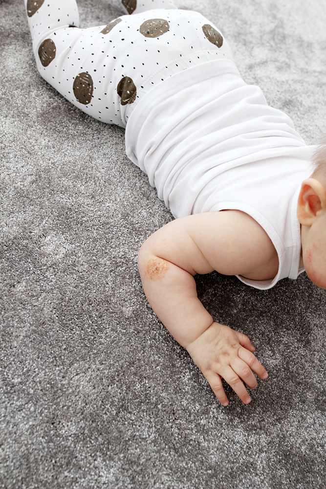 Jo ennen tuota käyntiämme Nilon iho oli jo jonkin aikaa oireillut erikoisesti. Molemmissa poskissa ja siellä täällä vartalossa oli pahannäköistä ihottumaa, jota hän usein hieroi ihan verille asti. Kävin näyttämässä Niloa lääkärissä useamman kerran ja joka kerta määrättiin vain kortisonia hoidoksi, joka auttoi hetkeksi, muttei poistanut itse ongelmaa. Halusin lähteä selvittämään asiaa paremmin ja varasimme ajan Pikkujätin allergialäärille, joka totesi sen olevan tavallista atooppista ihottumaa. Kerroin hyvin selkeästi, etten halua pientä vauvaa vuorata enää kortisonilla tai millään muullakaan lääkkeellä, mutta niin vain taas saatiin resepti seuraavaan lääkeaineeseen, jota olisi pitänyt levittää Nilon iholle monta kertaa päivässä.