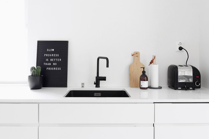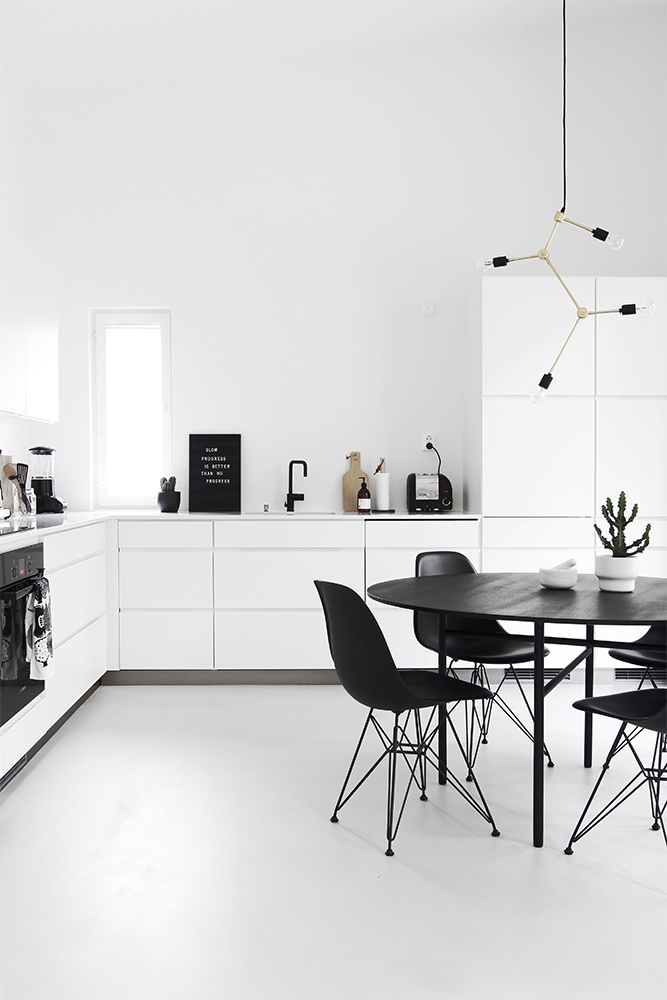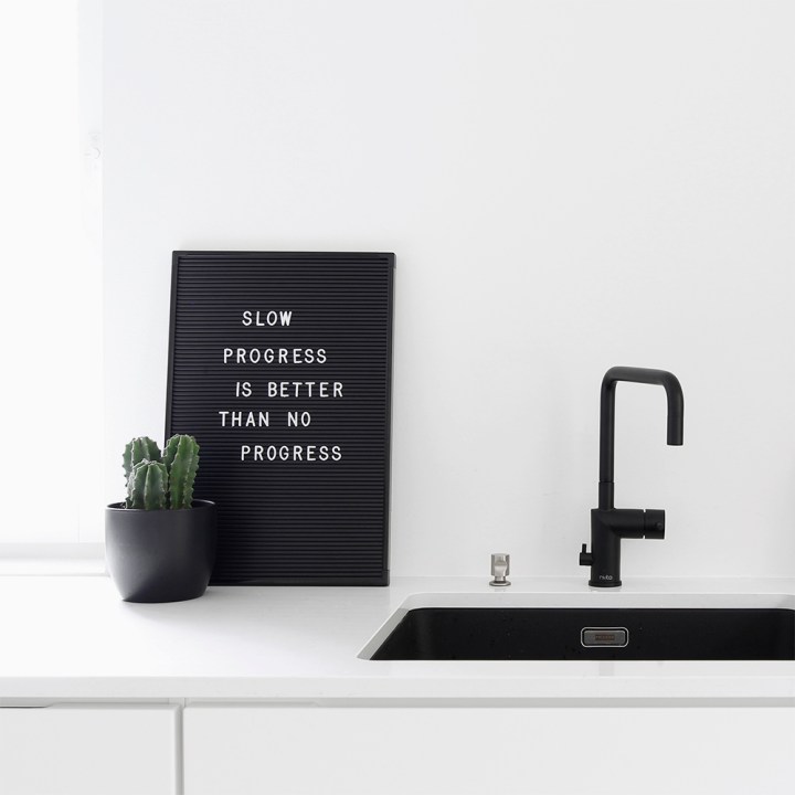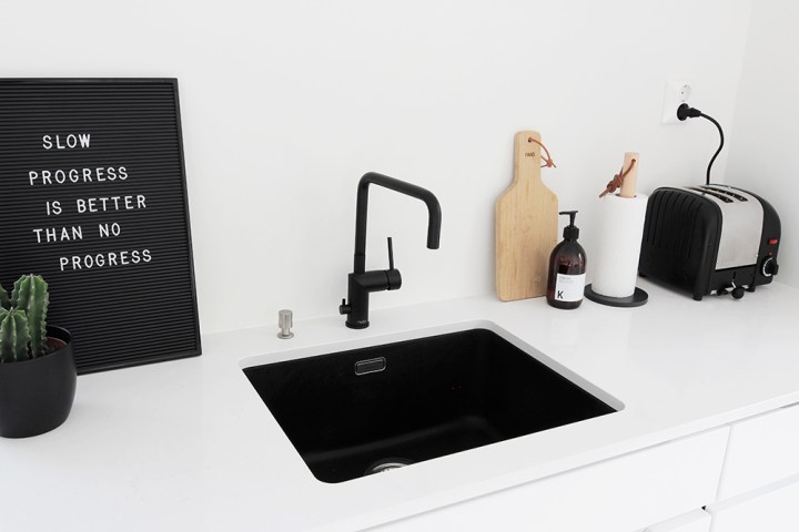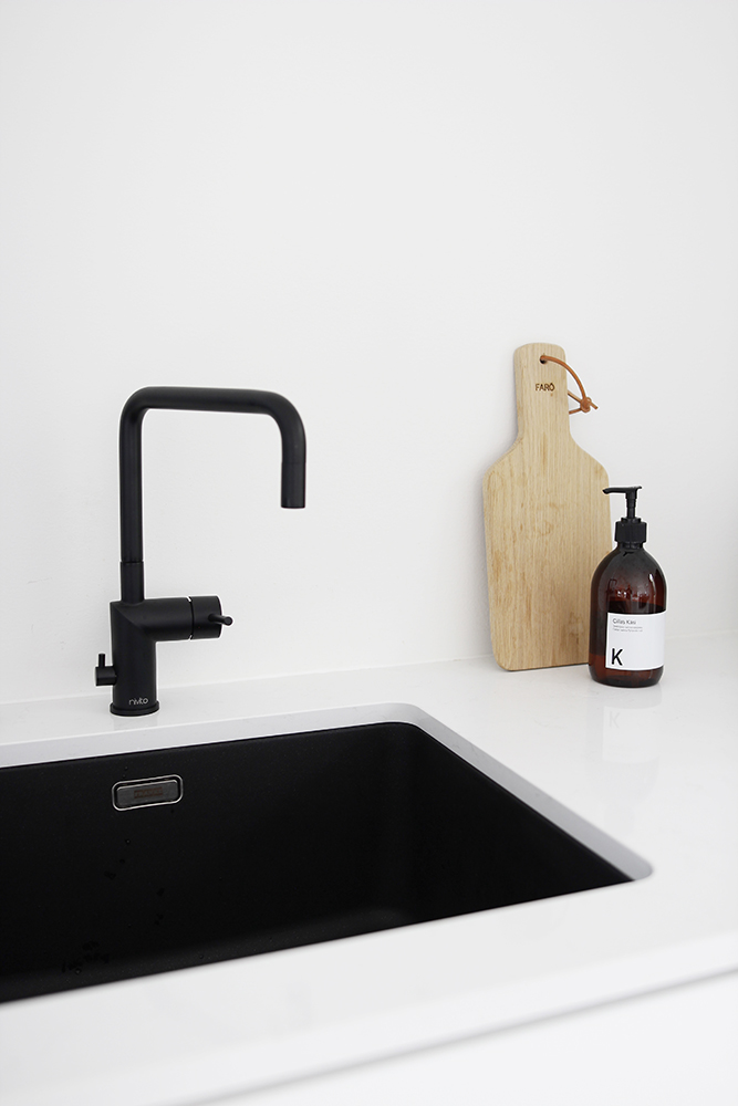Kvartsitaso, musta hana, iso allas sekä kaappien muutostyöt. Nämä olivat todella nopeat valinnat, mutta niin vain nopeastikin pystyy tekemään hyviä valintoja, kun oma tyyli ja toimintatapa on selvillä. Tykkään ihan älyttömästi, vaikka olisin halunnut puiset ovet valkoisten sijaan. Huomasin, että koko runko pitäisi vaihtaa ovien mukana, joten nähtäväksi jää mitä tehdään.