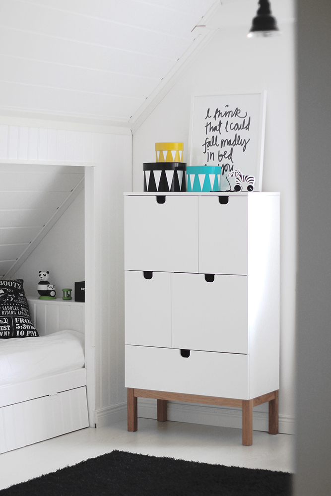 Haluan pitää lastenhuoneen sisustuksen pääosin mustavalkoisena, mutta tuoda värikkäillä esineillä piristävää kontrastia. Näitä väripilkkuja voi vaihdella helposti ja kokeilla erilaisia yhdistelmiä mielensä mukaan. Pikkuinen nukkuu jo omassa huoneessa, mutta eipä mene enää kauaa, kun siellä myös leikkii. Sitä lelua on sitten varmaan joka nurkassa, mutta ainahan kaiken saa järjestykseen, jos on… Read More